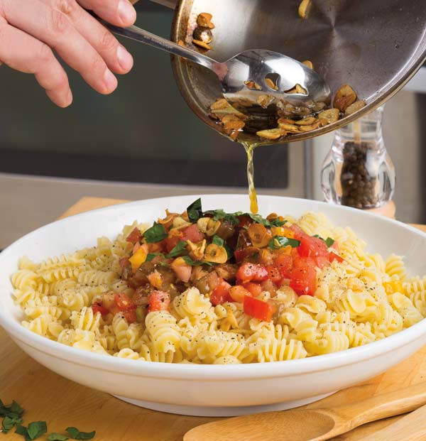 As for the pasta, choose one that is not too heavy for the light sauce (I used radiatore from DaVinci). It’s also imperative that you don’t rinse the pasta after cooking it. The tiny starches that are released by cooking – and still reside on the outside of the noodles (if not rinsed off) – will help the light olive oil and tomato-basil juices cling to them a little better. When just al dente, simply drain the noodles, toss with the other ingredients and enjoy!
