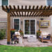 Erin planned and designed the pergola that tops a stamped-concrete patio that was enlarged, but decided to leave the construction phase to a pro. The fence section on the wall (to the left of the pergola) is being used to grow and train wisteria to climb over the pergola. The TV (the framed “art” to the right of the sliding doors) was another project through which she created a canvas under which a waterproof box was installed to hold the TV.