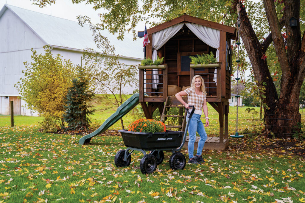 To transform the playset into a treehouse, Erin added a platform and what she calls “frou-frou.” It instantly became a favorite hangout for the neighborhood kids. It also landed her in the September 2021 issue of HGTV Magazine. “To this day, I don’t know how they found me,” she shares. “The contact just came out of nowhere. I suspect maybe it was through social media, maybe Pinterest. I know a lot of my blog traffic comes from it.” Erin keeps the treehouse in tip-tip condition. “One of these days, the boys will outgrow it. I’m thinking it would make a good wine bar or a ladies loft,” she says.