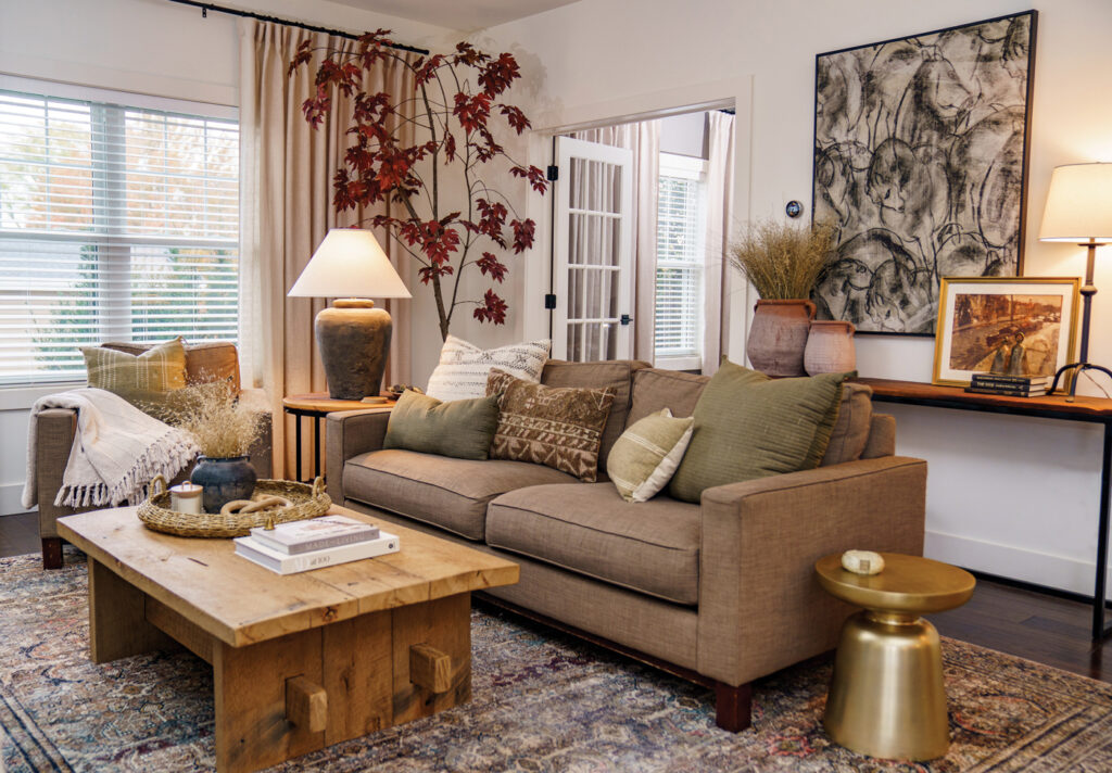 Comfortable was Erin’s gameplan in furnishing and decorating the living room. Again, it reflects her love of mixing styles and incorporating DIY projects. She built the coffee table and created the artwork on the wall, using fabric she purchased through Spoonflower. She even created the tree, using a fallen tree branch and silk leaves. The rugs seen here and in the dining room are from Loloi, a company she collaborated with to test the durability of their rugs. “At one point, I scrubbed one down in the driveway,” she says of putting it to the test. “Their rugs are awesome!”