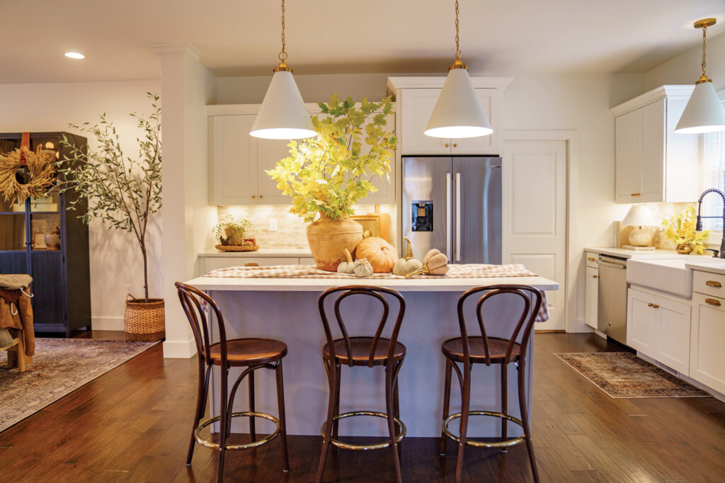 After moving in, Erin fully involved herself in DIY projects. “I began switching out the builder-grade elements, especially in the kitchen,” she says of replacing lighting, cabinetry hardware and plumbing fixtures. Next up is topping the existing cabinetry with glass-fronted designs, thus extending the cabinetry to the ceiling.
