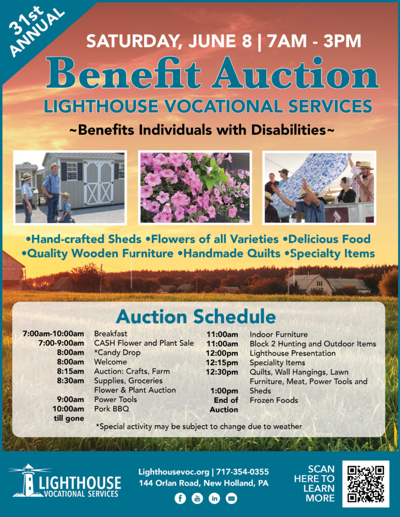 The Lighthouse Vocational Services Auction is back! It’s one day: Saturday Bid on anything from beautiful baskets of flowers to power tools, hunting/camping equipment, indoor furniture, hand-crafted sheds or specialty items. Be sure to bring the family for the candy-drop!