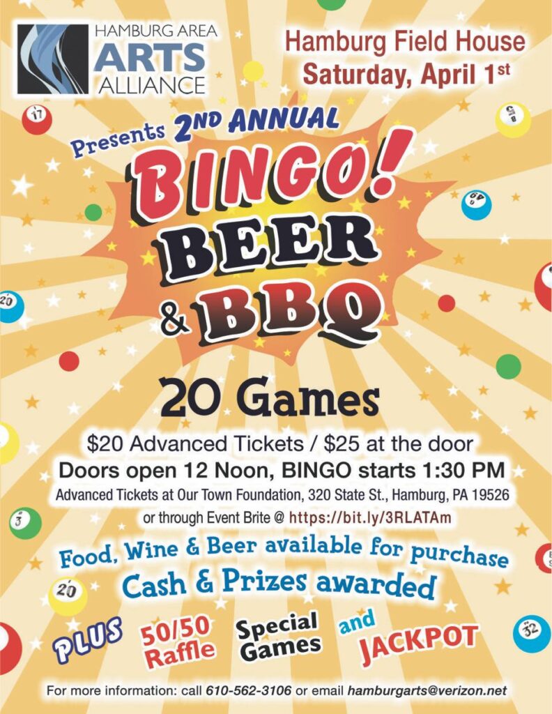 The Hamburg Area Arts Alliance presents its 2nd annual BINGO! Beer & BBQ at the Hamburg Field House on Saturday, April 1, 2023.