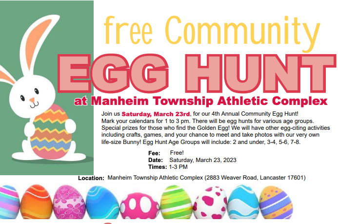 There will be egg hunts for various age groups (2 & under; 3-4; 5-6; 7-8) at this 4th annual free community egg hunt! There will be crafts, games, and photos with the Bunny. Visit website for details.