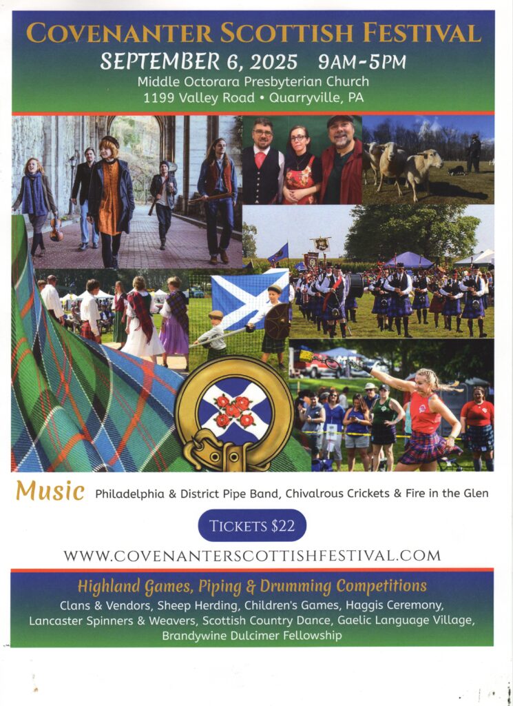 Music includes the Philadelphia & District Pipe Band, Chivalrous Crickets and Fire in the Glen. There will be Highland Games, Piping and drumming competitions, clans & vendors, sheep herding, Scottish Country Dance, Gaelic Language Village, Lancaster Spinners & Weavers, Children’s Games, Haggis Ceremony and Brandywine Dulcimer Fellowship.