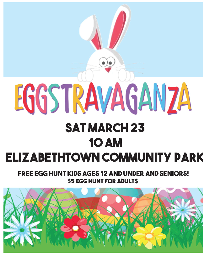 Egg Hunt begins at 10 a.m. Join the Easter Bunny for a FREE egg hunt for kids ages 12 and under! Other activities will include inflatables, games, food trucks and more! FREE Senior Egg Hunt (60+). Adult egg hunt (13+) $5 with great prizes!!