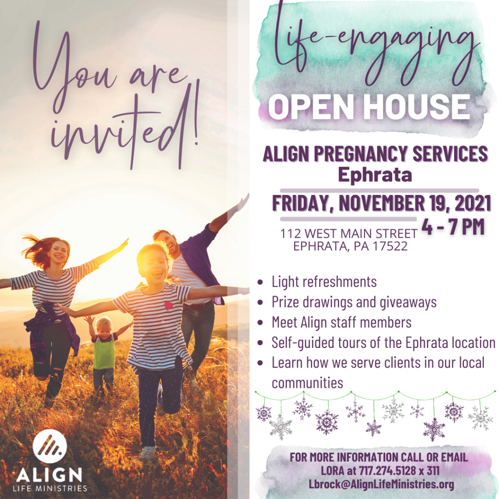 Enjoy light refreshments, prizes and giveaways, tours of the facility, meet Align staffers, and learn how we extend life-giving services to families in our communities. This is event is free and open to the public. All are welcome!