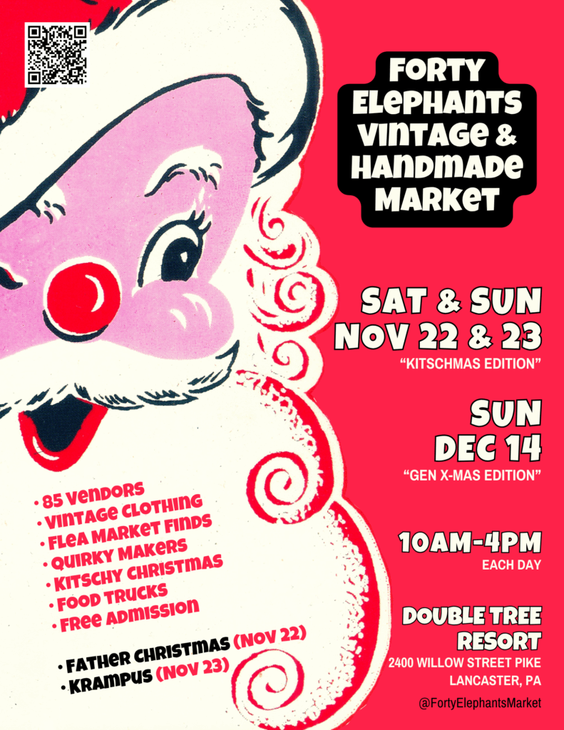 Forty Elephants Vintage & Handmade Market Kitschmas Edition is the weekend before Thanksgiving at Double Tree Resort. 85 curated vendors with everything for your vintage lifestyle! We’ll have vintage clothing & decor, flea market finds, quirky makers, food trucks, and goodie bags. We’re known for our vintage holiday decorations, so come experience the kitschy nostalgia of Christmas’ past. It’s the perfect place to find gifts for family and friends – and a little something for yourself. Plus, visits with Father Christmas (Sat) and Krampus (Sun).