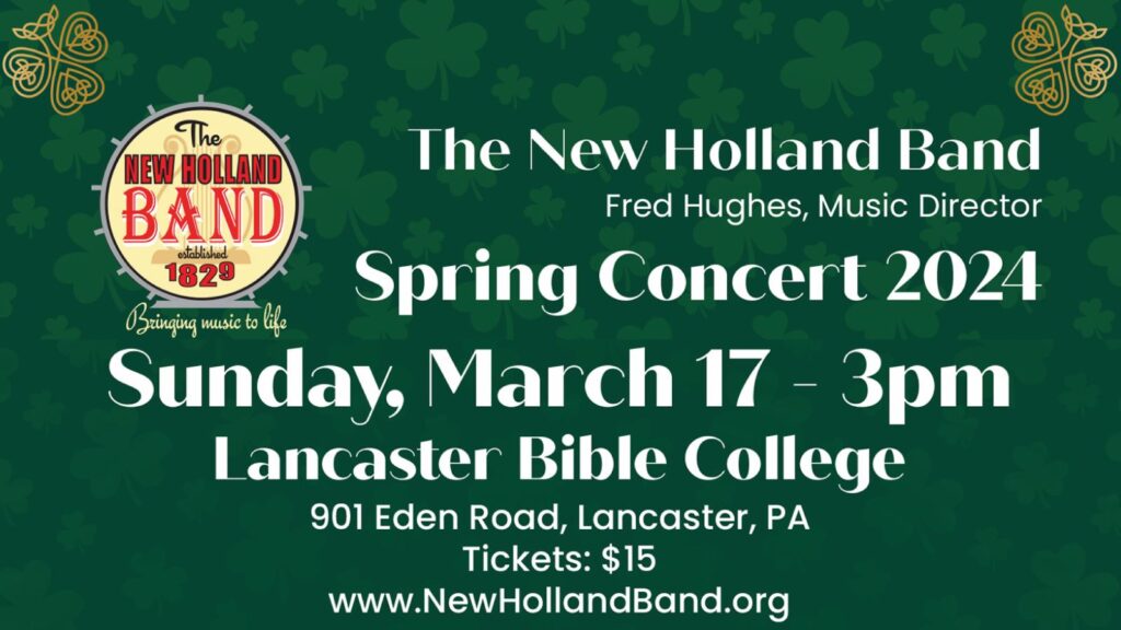 The New Holland Band introduces Fred Hughes, their new music director at their Spring Concert. Hughes becomes the 12th music director of the Lancaster County institution that is the 2nd oldest community band in the nation – – tracing its lineage to 1829. For his first concert as music director of The New Holland Band, Hughes has chosen a varied program that includes Rossini’s William Tell Overture, Sousa’s The Colonial Dames Waltzes, Selections from Encanto, marches, and several selections that play tribute to the concert falling on St. Patrick’s Day including Grainger’s Irish Tune from County Derry. The Band’s principal trumpet, Leon Hillard, will be featured on a piece titled Come Back to Sorrento and concertmaster Bob Hoch will be featured on the Weber Concertino for Clarinet and Band.