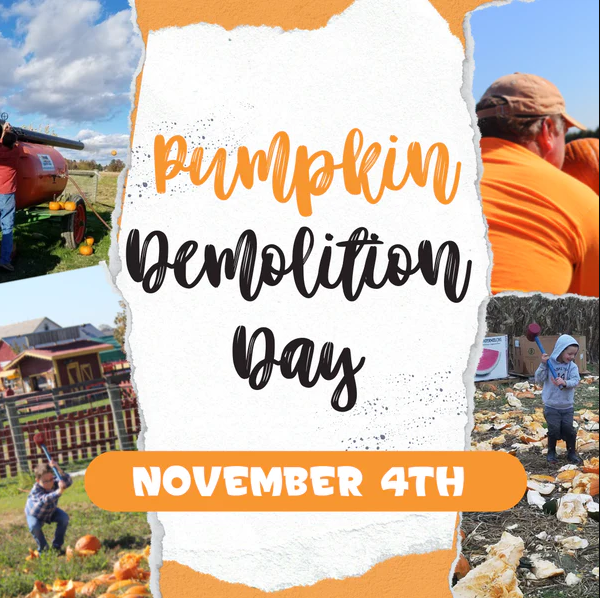 Enjoy the Barnyard Kingdom activities one last time before season’s end included with your Pumpkin Demolition Day Admission! Kick off the end of the Barnyard Kingdom season with a BANG! With lots of fun activities and pumpkin games, it will be a BLAST! Pumpkins are a delicious and nutritious treat for our beef cattle and they love smashing and eating the pumpkins left in the fields as they graze. Don’t worry, they enjoy picking up all the smashed pieces left behind after the festivities are over too! Purchase tickets online.