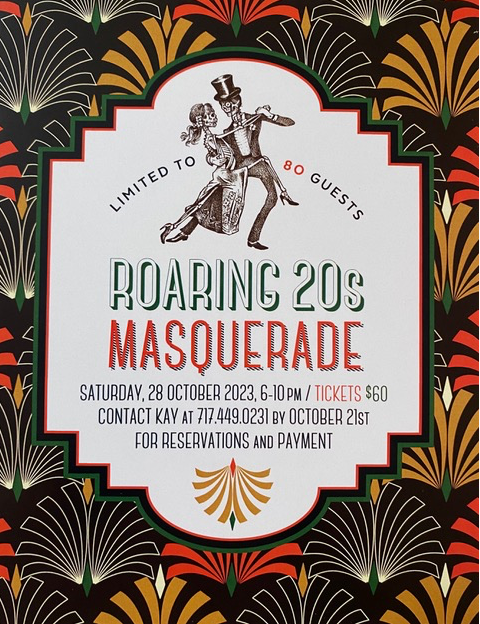 Promising to be a roaring good time! This 20’s Roaring Masquerade will include refreshements and heavy hors d’oeuvres. Proceeds from this event support to ARTS in Columbia. Call Kay by Oct. 21st for reservations.