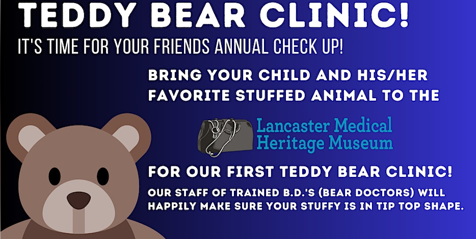 The Lancaster Medical Heritage Museum, a 501(c)3 non profit is excited to announce a heartwarming and educational event designed to alleviate children’s anxiety about doctor visits and explore the world of healthcare while having fun. The “Teddy Bear Clinic” offers a unique and interactive experience that empowers kids to become more at ease with medical check-ups by involving their trusted stuffed companions. The Teddy Bear Clinic promises an array of engaging activities. The Wellness Check for Stuffed Animals will include checking-in, height & weight measurement, ‘listening’ to their heartbeat with a stethoscope, and a mock vaccination. The Teddy Bear Hospital will involve experienced volunteers in the mending of any “injuries” or “illnesses” they may have. At the Interaction With Healthcare Professionals area, children will have the chance to meet doctors, nurses, and other medical staff who will share their expertise and answer questions.