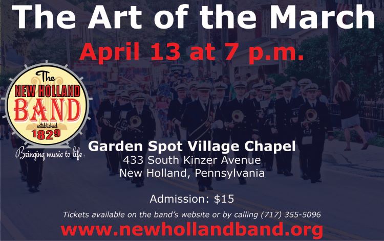 The musical genre known as the march can be characterized as having a strong regular rhythm, written for marching, and most frequently performed by military bands. Most of us are familiar with the March King – – John Philip Sousa. However, did you know that some of our greatest classical composers wrote marches for various occasions such as the coronation of a king or larger productions such as the opera? The New Holland Band will take you on a journey through this magnificent art form with selections including Sir William Walton’s Crown Imperial, Julius Fucik’s Entry of the Gladiators, Robert Browne Hall’s March Funebre, and John Williams’ Raider’s March. Hear the stories behind some of your favorite marches including a lesser-known Sousa composition – – Mother Goose March. Tickets for the 7 p.m. concert can be purchased from the Band’s website. Once on campus at Garden Spot Village, follow the signs to the chapel.