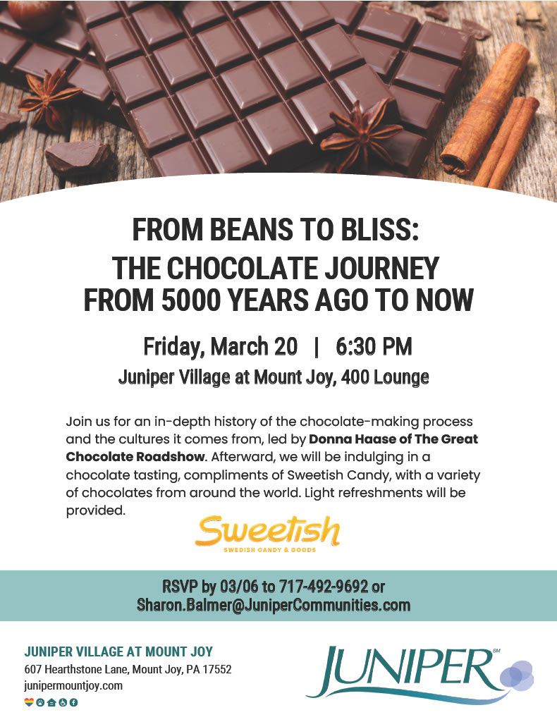 Calling all chocolate lovers! Join us at Juniper Village at Mount Joy on March 20 at 6:30 PM as we welcome Donna Haase of The Great Chocolate Roadshow. Donna will guide us through chocolate’s journey from ancient cocoa beans to the treats we enjoy today. Donna has taught hundreds of chocolate classes and earned certification from Ecole Chocolat, an online chocolate college.