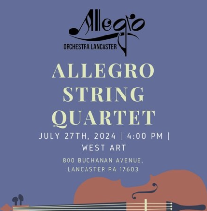 The concert features ensemble comprised of Allegro musicians include: Melody Cliff, Violin Betsy Swartz, Violin Christy Kauffman, Viola, and Beth Lavender, Cello