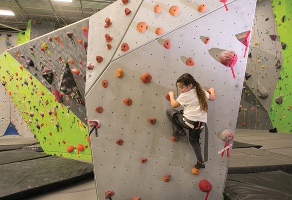 Kids to adults can participate in both climbing areas, but “28 pounds is the minimum. We’ve had 3-year-olds climbing in here before. It’s a little more challenging at that age, but as long as you’re within the weight limit and you can fit into a harness safely, really anyone can climb.”