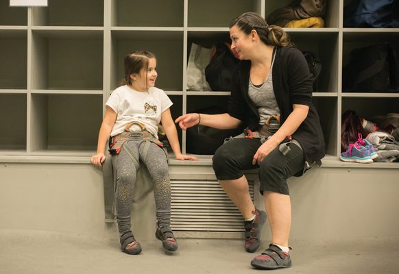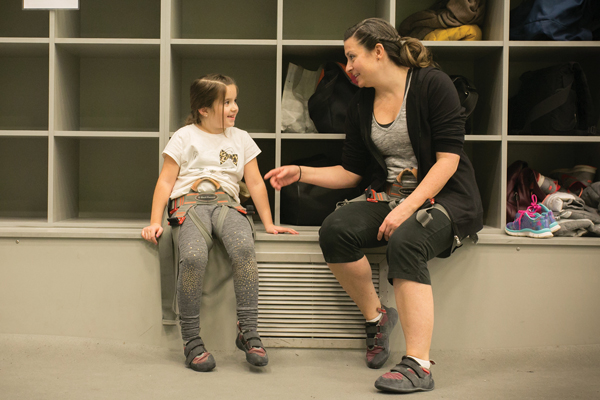 She was nervous at first, which showed as she fidgeted about the cushioned floor, but those nerves gave way to anticipation once our instructor, Director of Adventure Adam Bofinger, briefed us on safety guidelines, equipment usage and climbing procedures.