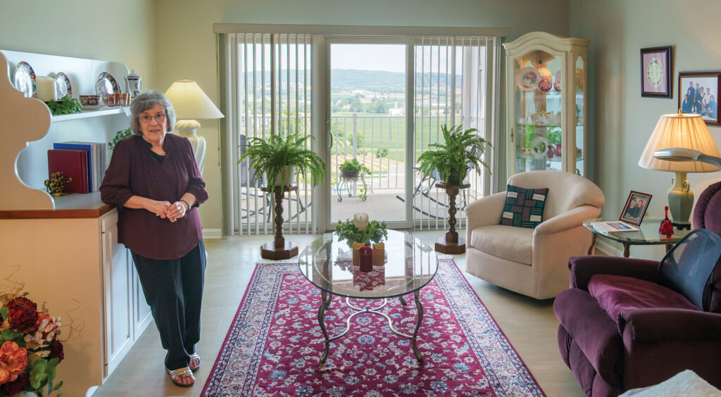 The centerpiece of Mim Mylin’s living room is the hutch her late husband, a cabinetmaker, made. It holds treasures such as the many scrapbooks Mim has assembled that chronicle the lives of her children and grandchildren. The apartment also offers a stellar view of the countryside.