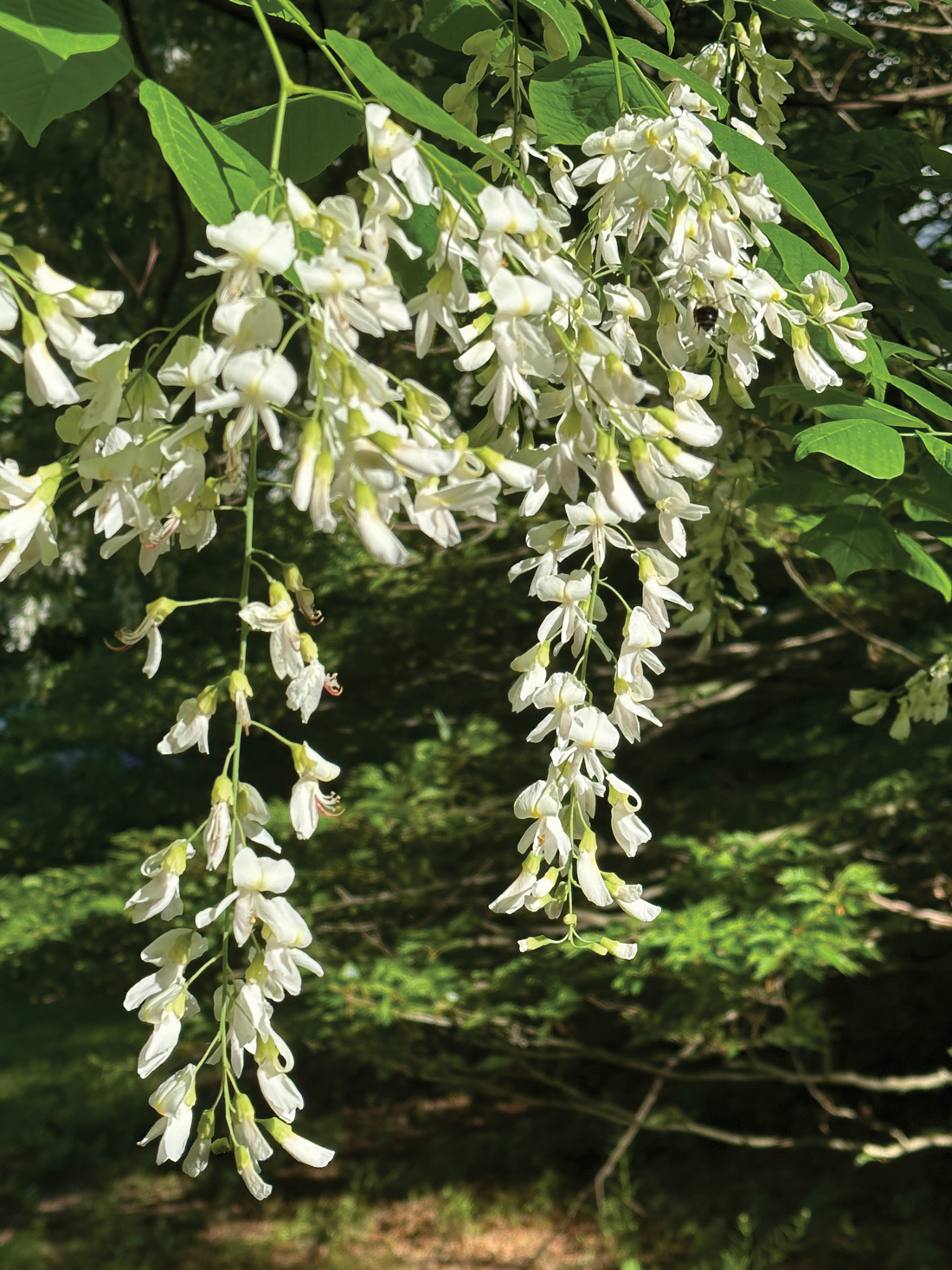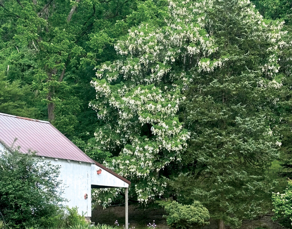 Another flowering tree that is seldom planted in the home landscape is the American Yellowwood, Cladrastis kentukea (sometimes listed as C. lutea). Flowering in late spring, it is obvious from the striking large wisteria-like (10-15 inches long) drooping panicles of white flowers that it is in the legume (pea) family.