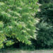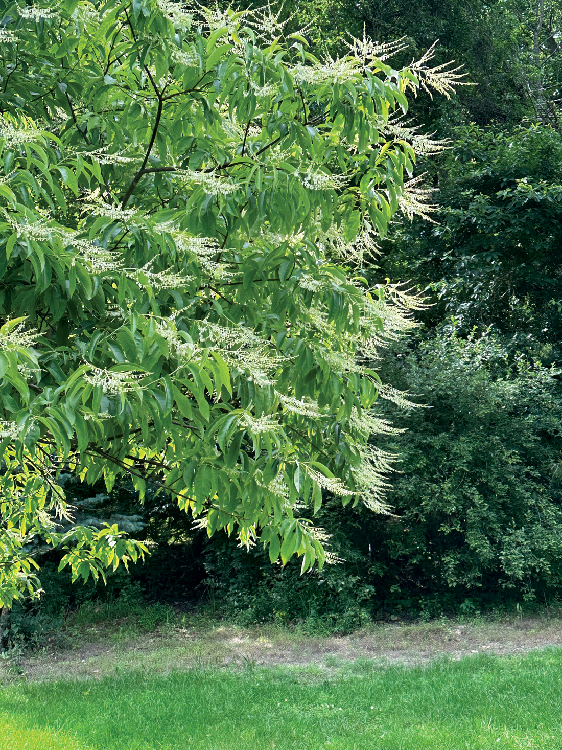 The shrub’s July flowers are showy. The erect cylindrical 12-inch-long panicles of white flowers have conspicuous red anthers. A butterfly magnet. The foliage turns bright-yellow in the fall for a brief spell before dropping. Sometimes the flowers give way to “buckeye” nuts that I think the squirrels must gather and plant because I find seedlings at a distance from the host plant.