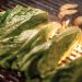 Romaine lettuce hearts were sliced in half, coated in olive oil and grilled on a searing hot cast-iron grate on a natural gas grill. Bacon was grilled directly on the grates, and a dressing was made with fermented apple cider, vegetable oil, mustard, ground cinnamon and apple cider vinegar. Creamy blue cheese slices balanced the acidity of the dressing perfectly.