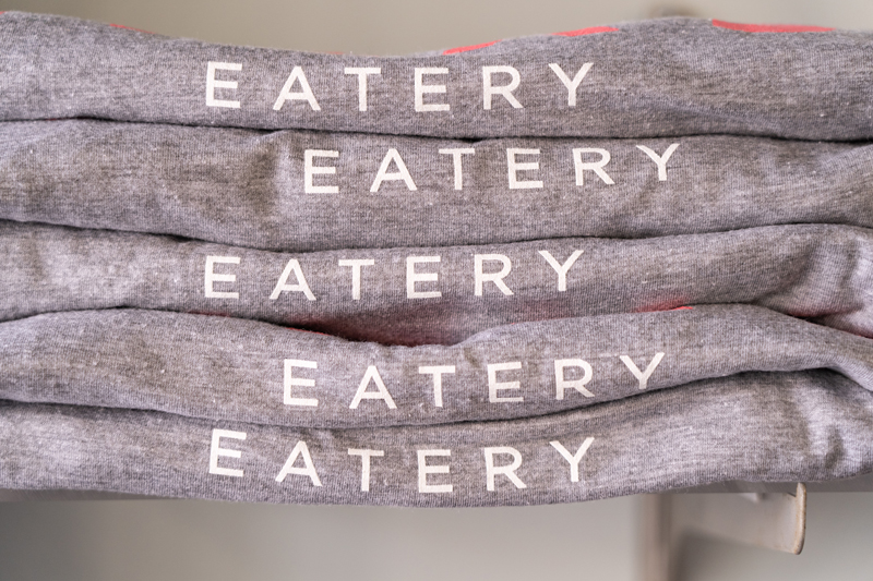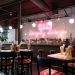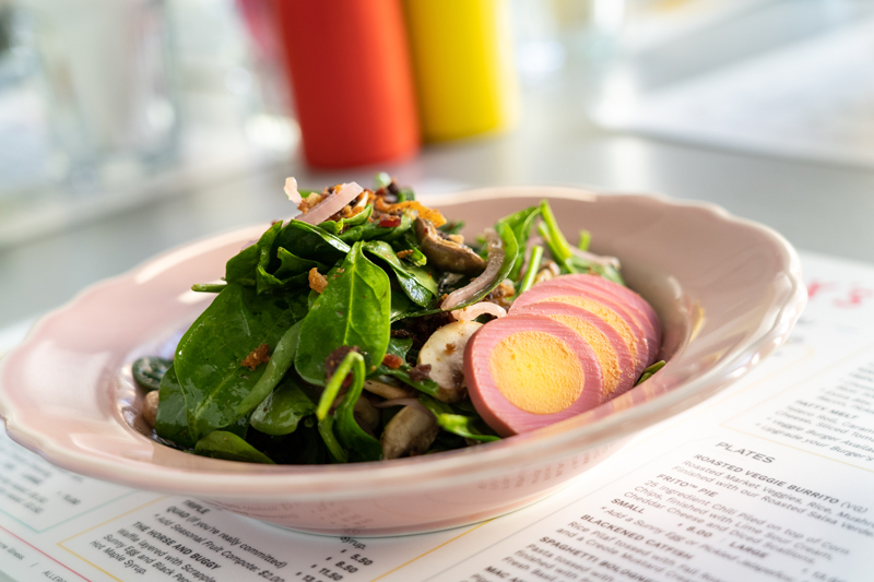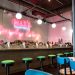 The interior, which is characterized by exposed brick and high ceilings, offers seating for about 115, including tables in the two storefront windows that flank the doorway. A counter features seating on soda fountain-style barstools. The restaurant’s name and motto are emblazoned in neon pink behind the counter/bar. Matt says the counter styling was inspired by sushi counters, which traditionally have two tiers. “We deliberately designed the counter to be two-tiered rather than a flat bar top,” Matt notes.