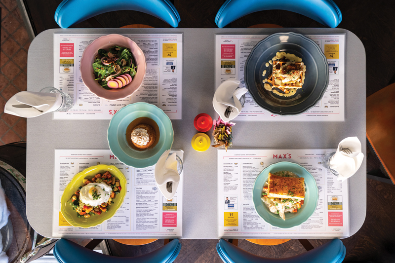 Max’s offers an “all-day” menu. “Breakfast meetings are popular downtown, so we offer breakfast items. But we’re also an everyday eatery, so we want someone coming home from third shift to be able to order breakfast, a sandwich or an entrée,” Megan says.