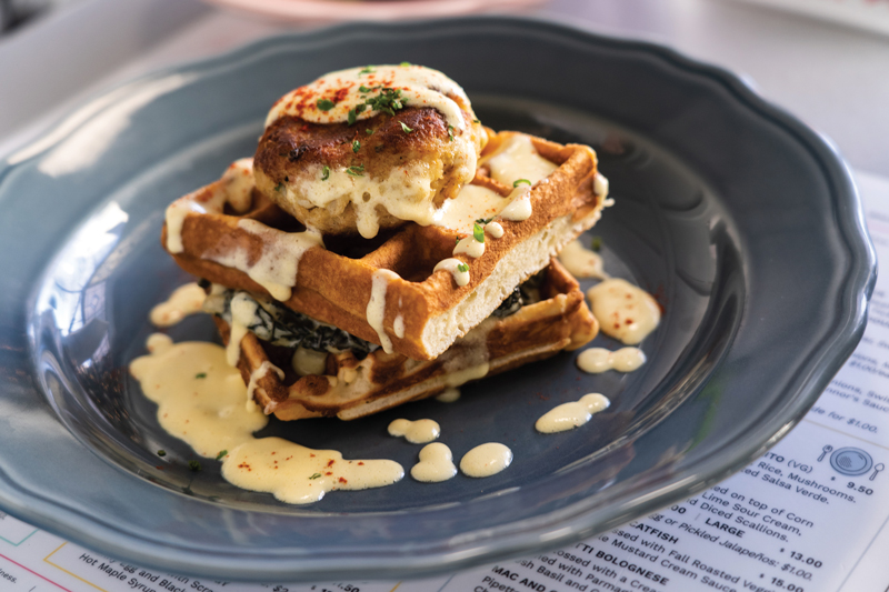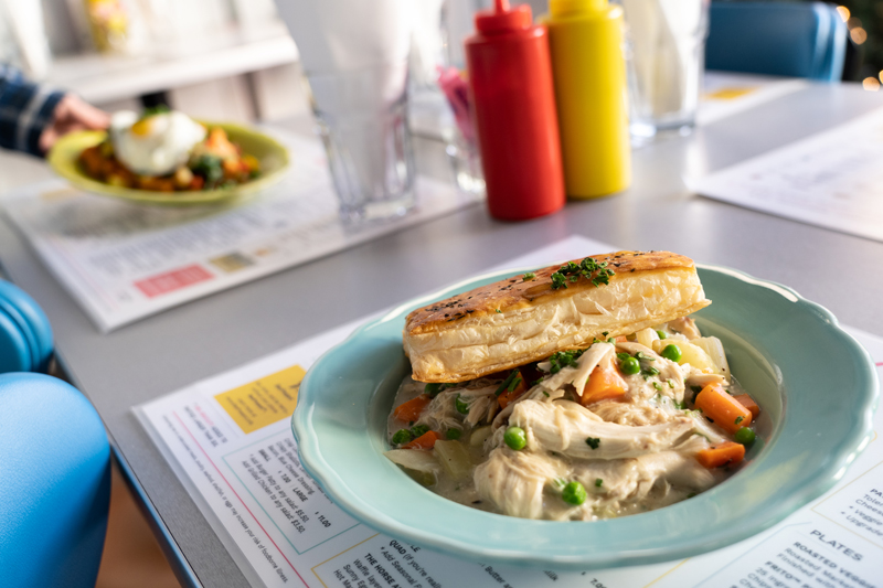 Matt says the menu will change two to three items annually as seasonal items are added. For example, the recent “Sweater Weather” menu included a Fall Gobble sandwich – house-roasted turkey, herb mayo, cranberry relish, bacon and sambal slaw on a toasted pretzel roll. The menu also features sweet potato hash, roasted veggie burrito, burgers, chicken puff pie, spaghetti Bolognese, a Caesar salad, and hot popper crab dip. For those on the go or for family dining, there’s a cereal bar.
