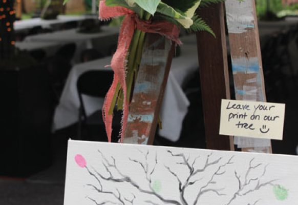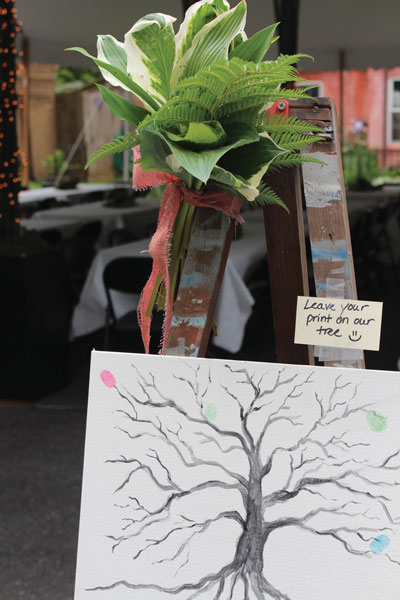 Floral Designs of Mount Joy owner, Jill Erb, provided most of the flowers for the bouquets, plus all the other floral material, which in Kelly’s opinion, “made everything come together in such a beautiful fashion.” While all the ceremony and reception pieces coordinated, different themes were used throughout the property. For example, table centerpieces, which were designed and made by Kelly, utilized tree branches that were collected in the woods. Moss, succulents and air plants were attached to the branches that rested atop large hosta leaves.
