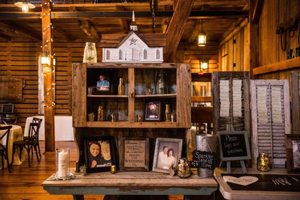 The venue perfectly lent itself to Lauren’s rustic-elegance theme. It also meshed with the romantic ambiance she wanted to create. Vintage accents and a proliferation of florals helped to carry out the theme. Her favorite rustic touch was the dessert table that saw cupcakes spilling out of a tipped-over barrel.