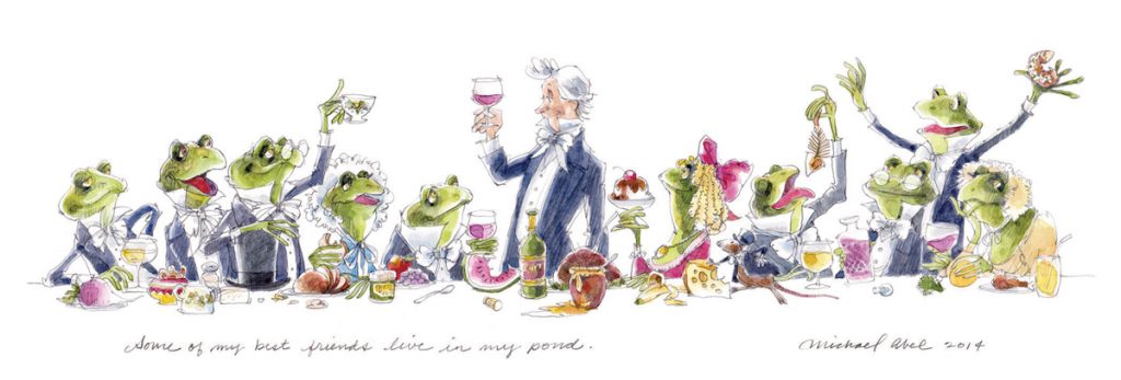 Look closely, and you will notice that many illustrations for LancasterHistory.org invitations include a frog. The green fellow is often dapperly dressed, involved in the spirit of the party’s theme, and standing side by side with prominent historical figures like Lancaster’s only U.S. President, James Buchanan. Why? “President Buchanan enjoyed spending time in thought at his Wheatland’s frog pond,” says Mike. “And, he once said he hoped in another life to come back to live as a frog in that pond.” Mike has at least granted Buchanan’s wish in pencil sketches and watercolors.