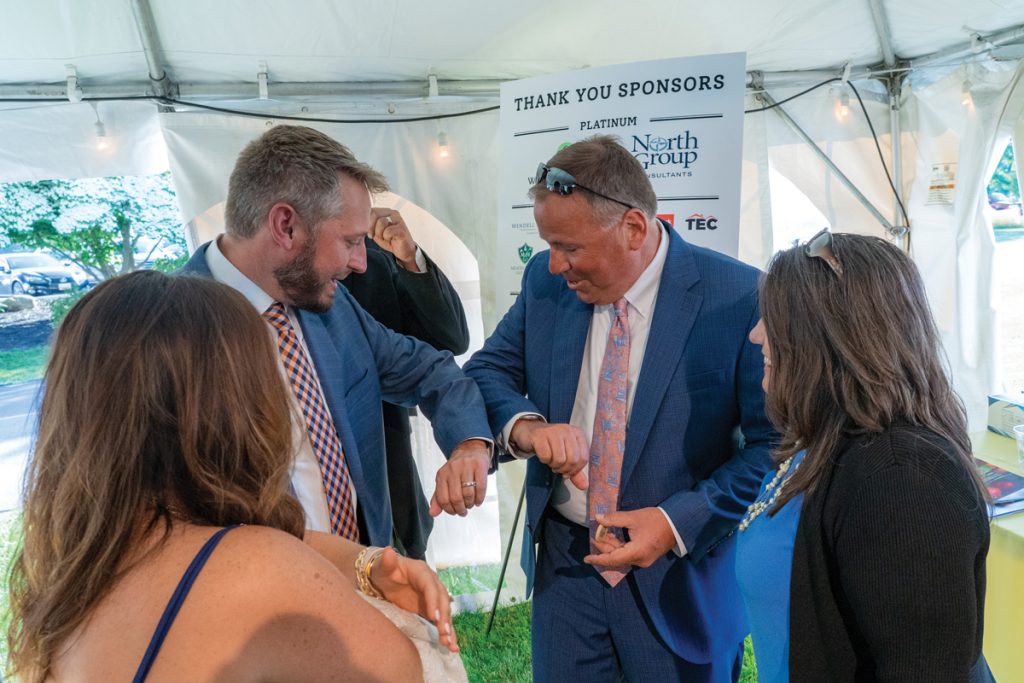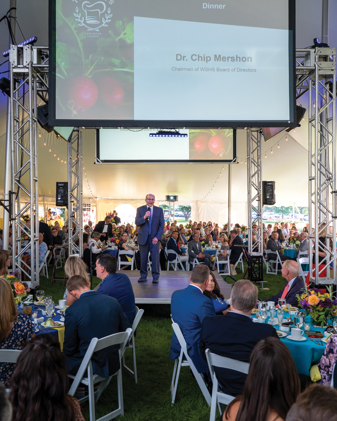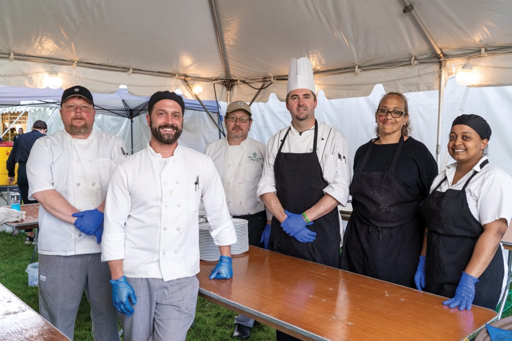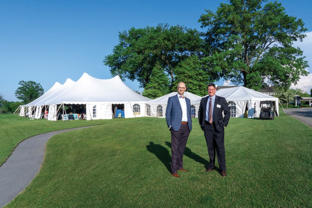 Behind the scenes, Lancaster Country Club’s executive chef, Tanner Seipp, was orchestrating a multi-course dinner that featured specialties from seven of Lancaster’s finest restaurants. It takes a village of tents to support an outdoor event of this scale, including food preparation, covered canopies over paths in case of inclement weather, plus an additional 800-square-foot tent for guest receiving, check-in and silent auction areas.