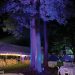 While the visual effects were greatly simplified, the quiet drama of being outdoors was enhanced by the colorful uplighting of large trees and light projections on the museum wall. “We defined the space with arches of pipes in the ground, covered with stretch fabric, to give guests a feeling that they were in a special place within the natural world,” says Tom.