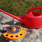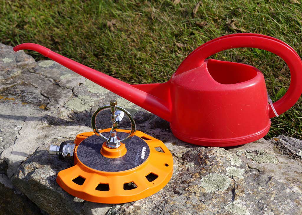 spinning or impulse-type sprinklers work very well. Again, Dramm makes one that creates a fine mist spray that requires less water for thorough watering, plus it works with low water pressure. It is made from metal and colorful models are available with circular, stake or wheeled bases.