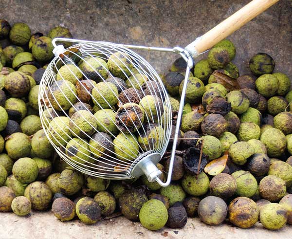 Occasionally, I discover a new gardening tool that I wish I’d had years ago. The Nut Wizard (item NWW, amleo.com, $64.99) certainly qualifies. I got an immediate assessment on my purchase from my teenaged garden helpers, who pronounced it “awesome” and “radical.” For decades, I’ve been faced with bending and picking up countless bushels of walnuts and their indelibly-staining hulls dropped alternate years by the giant walnut tree that stands just outside my porch and extends over the driveway. With this device, one stands upright and simply rolls it over the nuts lying on the ground; the spring-wire head traps them inside. It is emptied by spreading the wire, which allows the captured thugs to fall right out. It can also be used for sweet-gum balls. There are other versions sized for hickory nuts, buckeyes, acorns and crabapples.