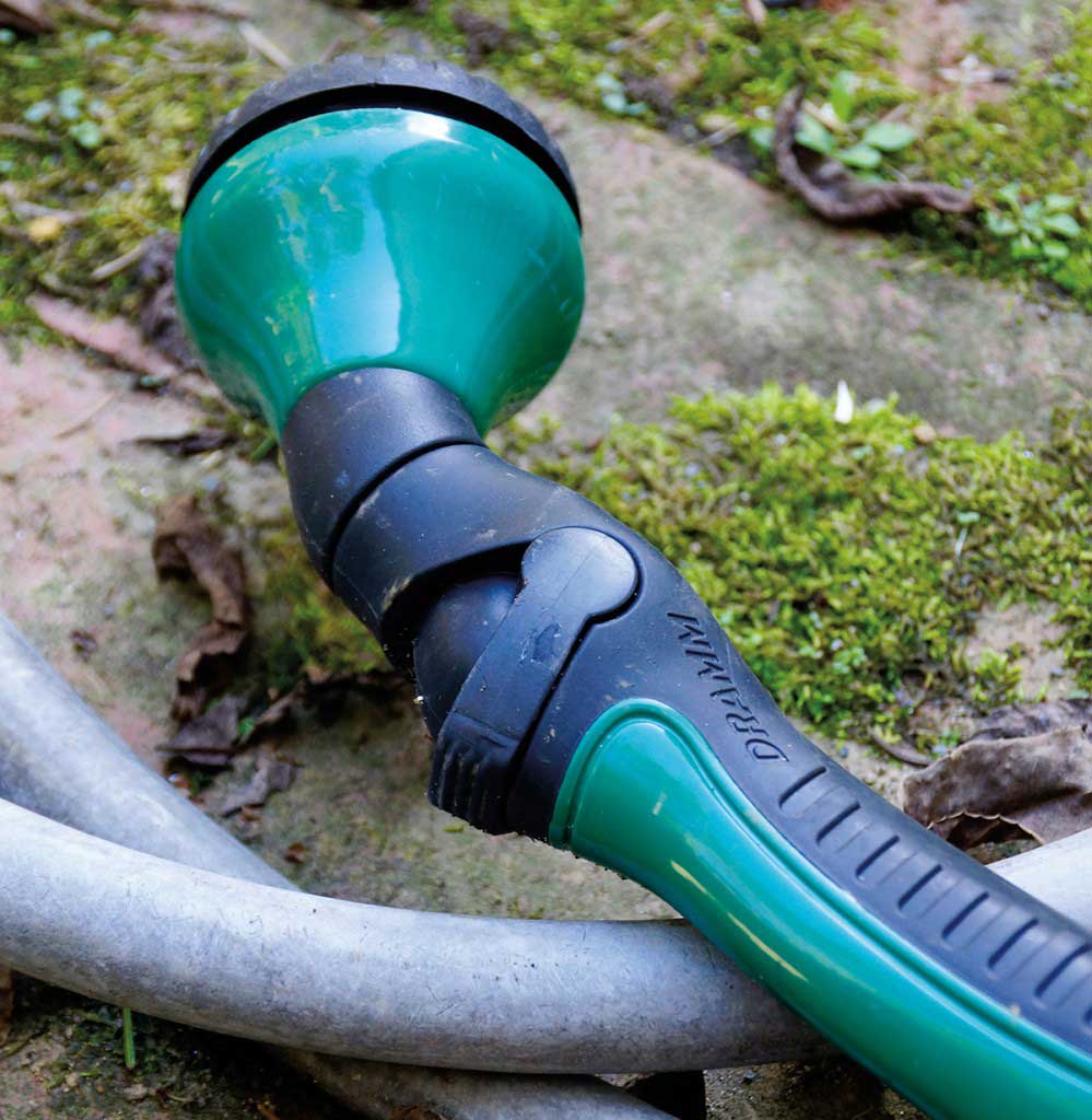 Another nifty product from Dramm is its One Touch™ Shower & Stream™ hose nozzle. It has a clever, thumb-controlled shut-off valve and provides the only two patterns one actually uses. It is made from heavy-duty metal, not plastic, and has an ergonomic design.