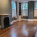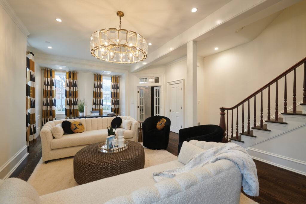 As for the living-room area, the staircase was stripped of its white paint and returned to its original appearance. Flooring throughout the first floor living areas was replaced with oak hardwood. In doing so, the installers from Caliber Hardwood Floors were able to eliminate the high and low spots in the floor. An alcove was created by Rittenhouse that serves to separate the kitchen/dining areas from the living room. It also tricks the eye into not noticing that the ceiling heights are different in the two areas.