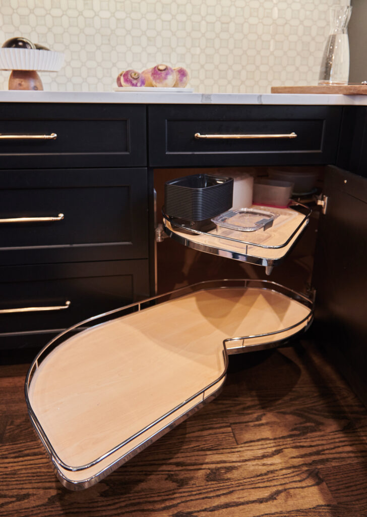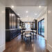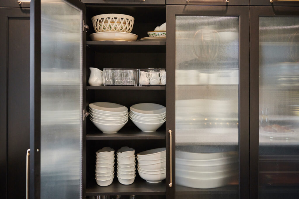 Because of the array of storage, the kitchen can remain organized and uncluttered. “We solved the storage issue by looking up,” says Karen of the cabinetry that extends to the top of the high ceiling.
