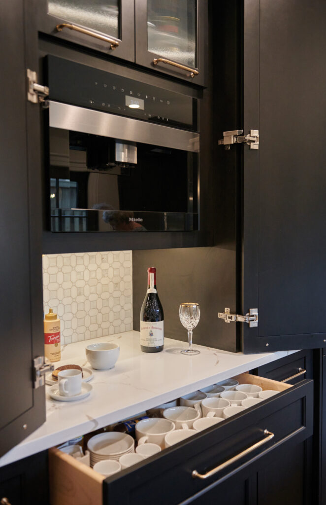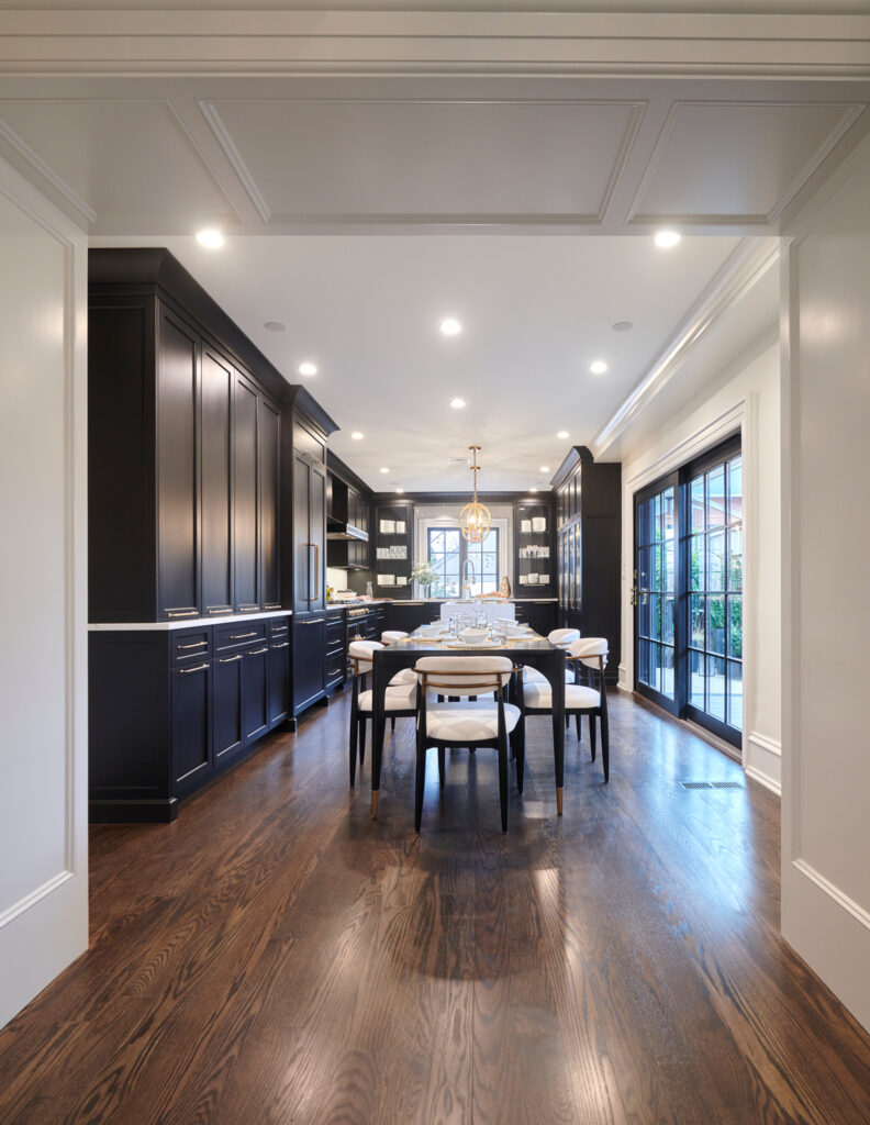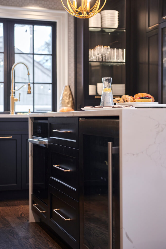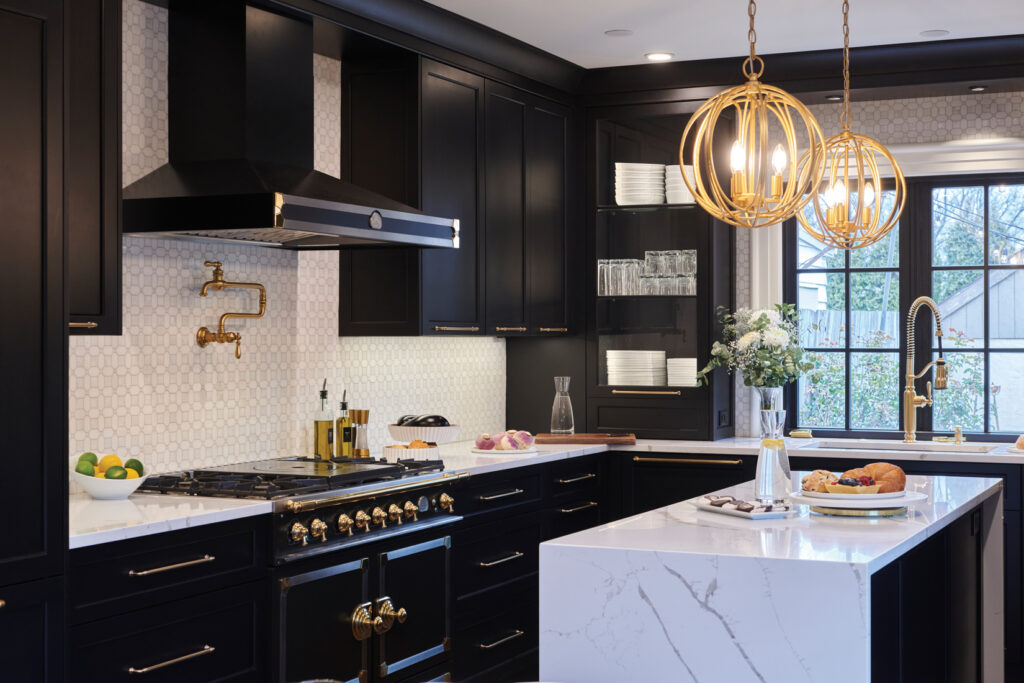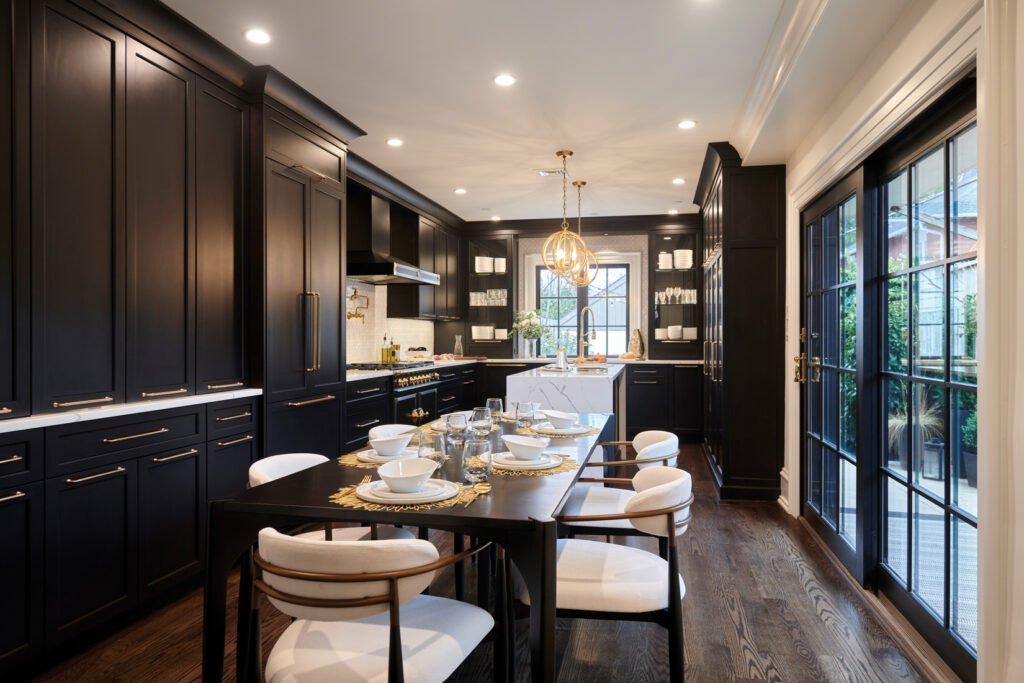 Karen was planning to go with white cabinetry in the kitchen but trusted Olga’s opinion that dark cabinetry would better suit the Old World-meets-glam design theme. Instead, the white element was achieved through the quartz that covers the counters and backsplash, while the gold is reflected in the hardware, lighting and plumbing fixtures. The table is a custom design that can expand to accommodate dozens of guests.