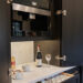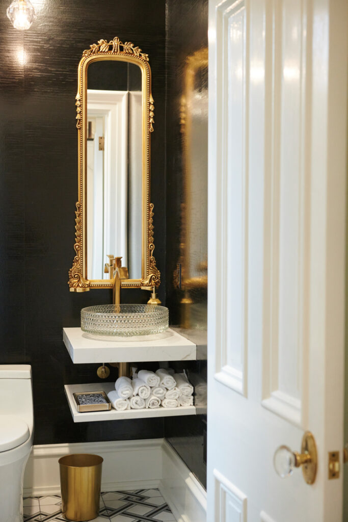 The original powder room adjoined the dining room. It was relocated to a more private niche between the living room and dining area. It, too, embraces the black-white-gold color scheme and echoes the French vibe of the living room. The mirror was sourced in Turkey.