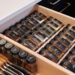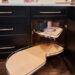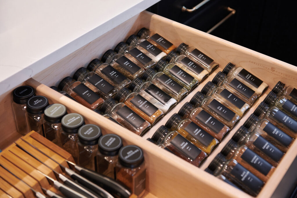Organization plus! Because of the many storage amenities, the kitchen stays organized and tidy. The amenities include a glass-fronted cabinet for tableware; pull-outs for cookware; drawers for herbs and seasonings; and, in the dining area, a beverage station (with retractable doors). The multifunctional work-station sink makes food prep and clean-up easy, thanks to the cutting board and drying rack.