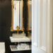 When the wall came down in the living room, the added space allowed for the inclusion of a formal entry area and coat closet. The powder room was moved to a more private space and beautifully continues the back-gold-white color scheme.