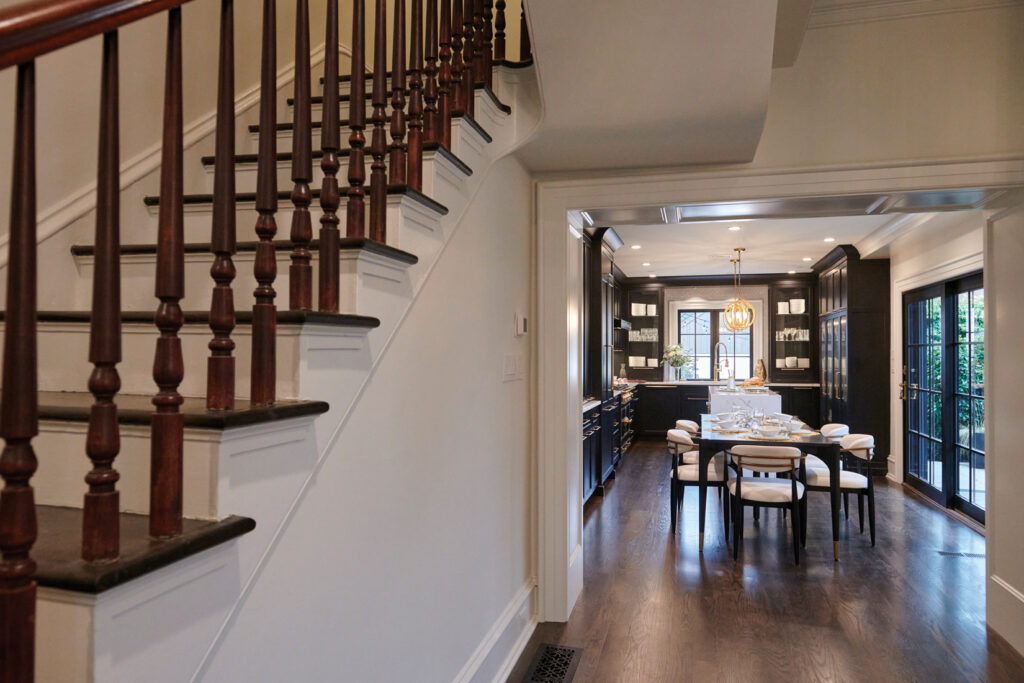 An alcove was created to provide a wider passage between the living room and dining room-kitchen. Moldings that define it were replicated to match the originals in the house. The staircase was also returned to its original appearance.