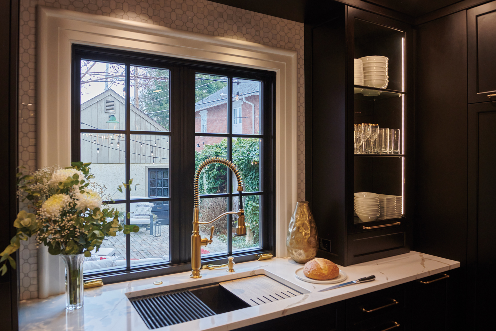 Initially, Karen was leaning in the direction of white cabinetry for the kitchen, but it was Olga who convinced her that dark cabinetry would set the Old World tone she desired. “I’m so glad I listened to her,” Karen says of the walnut stain that was subtly darkened further with the addition of black paint. Fearful that the dark cabinetry would make for a gloomy kitchen, Rittenhouse solved that issue by opening the exterior side wall and outfitting it with a sliding patio door that not only floods the space with light but provides a more convenient entry way to the outdoor living area.