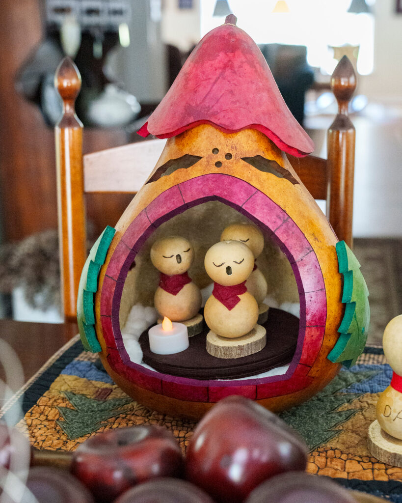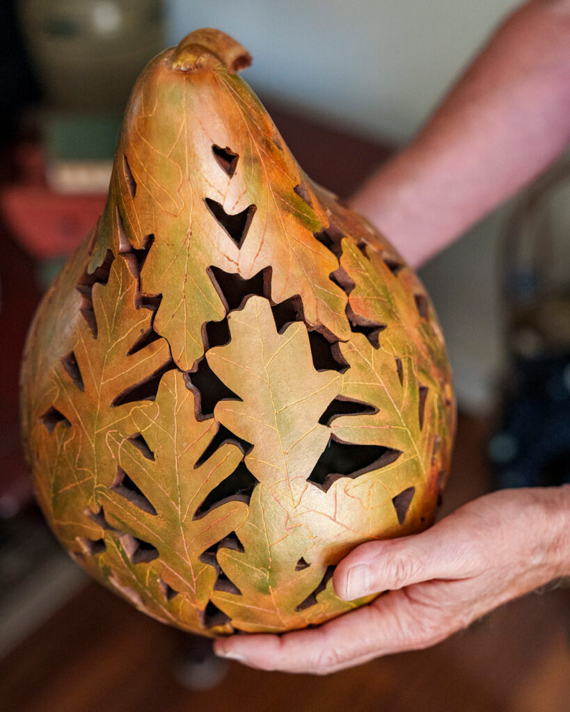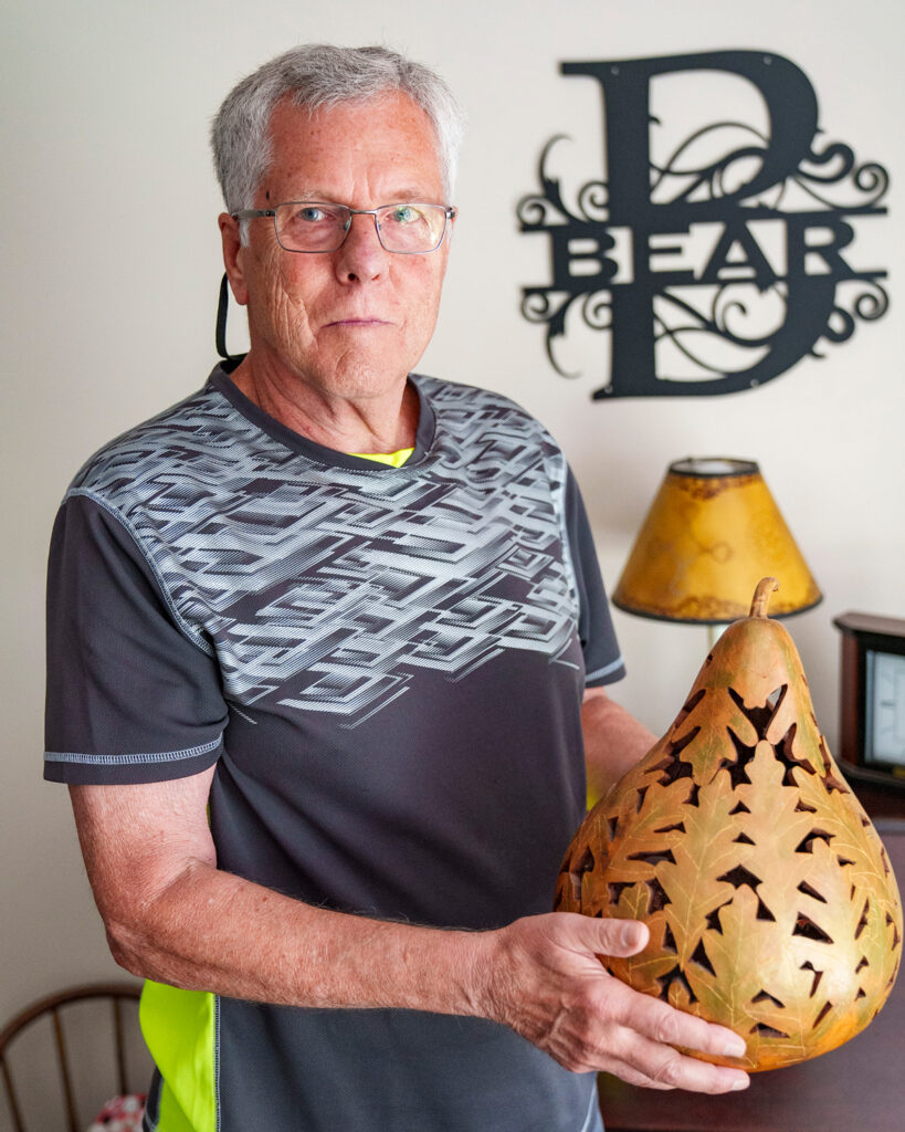 How did gourds become Jim’s creative outlet? Spying a bear-inspired decorative gourd at her brother’s house about 8 years ago, Linda shared how much she liked it, prompting Jim to try crafting one of his own. Even though he didn’t have the correct tools, he successfully created a “bear” gourd that now resides with them in their cottage at Homestead.