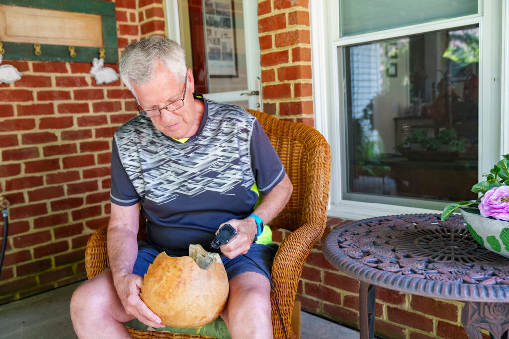 When Jim and his wife, Linda, moved to Homestead Village, it did not mean that Jim had to downsize his hobby of turning gourds into decorative and seasonal works of art. The covered patio at their home provides a place where he can work and commune with nature. The garage was roomy enough to accommodate a workbench. There’s also plenty of room to display his handiwork.