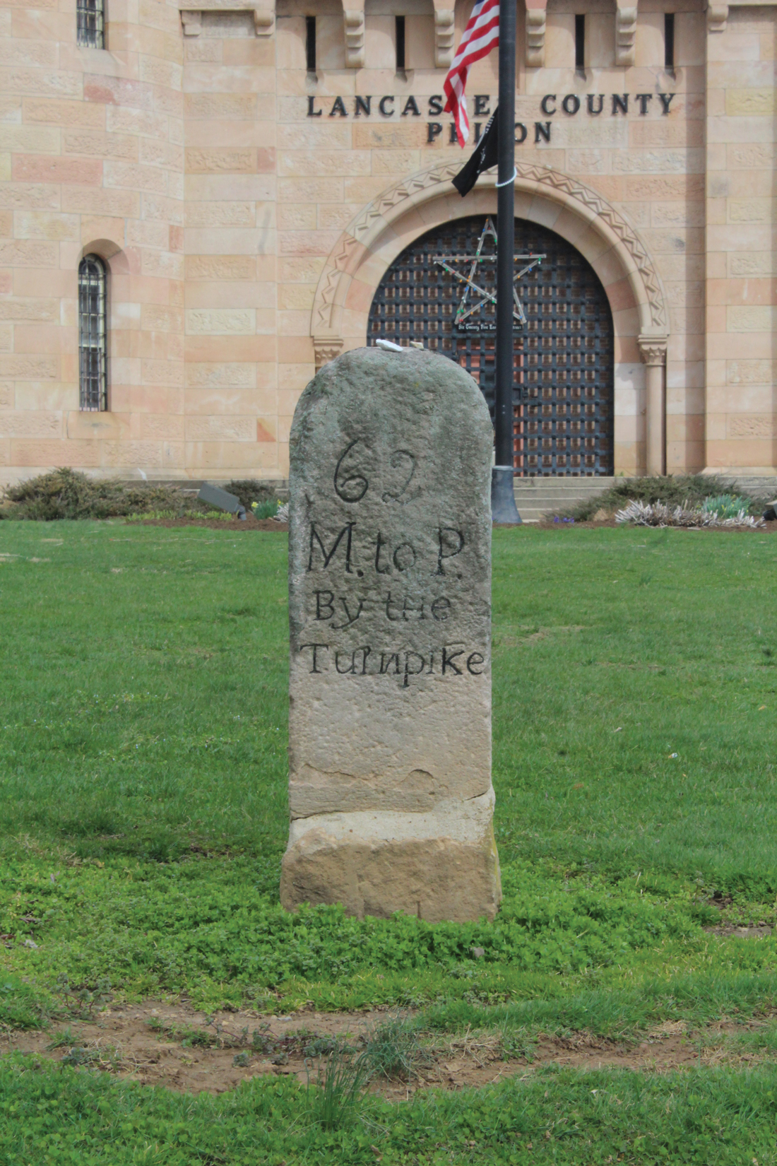 For example, one such milestone stands on the grounds of The Castle, aka Lancaster County Prison, on East King Street. It’s obviously been there for a long time, since the turnpike to which it refers is the Philadelphia/Lancaster Turnpike, which opened in 1795.