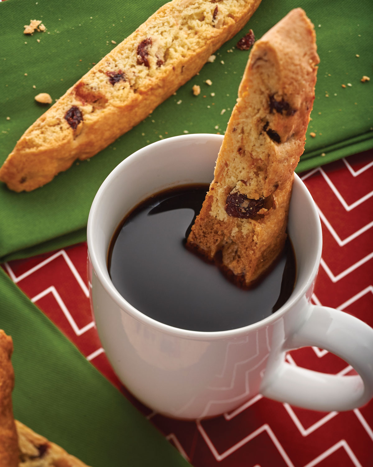 Homemade cranberry-almond biscotti paired with Lancaster County Coffee Roaster’s Lancaster Signature Blend. Cranberry-walnut olive oil was chosen over vegetable oil, adding a warm, seasonally rich flavor while reducing saturated fat.