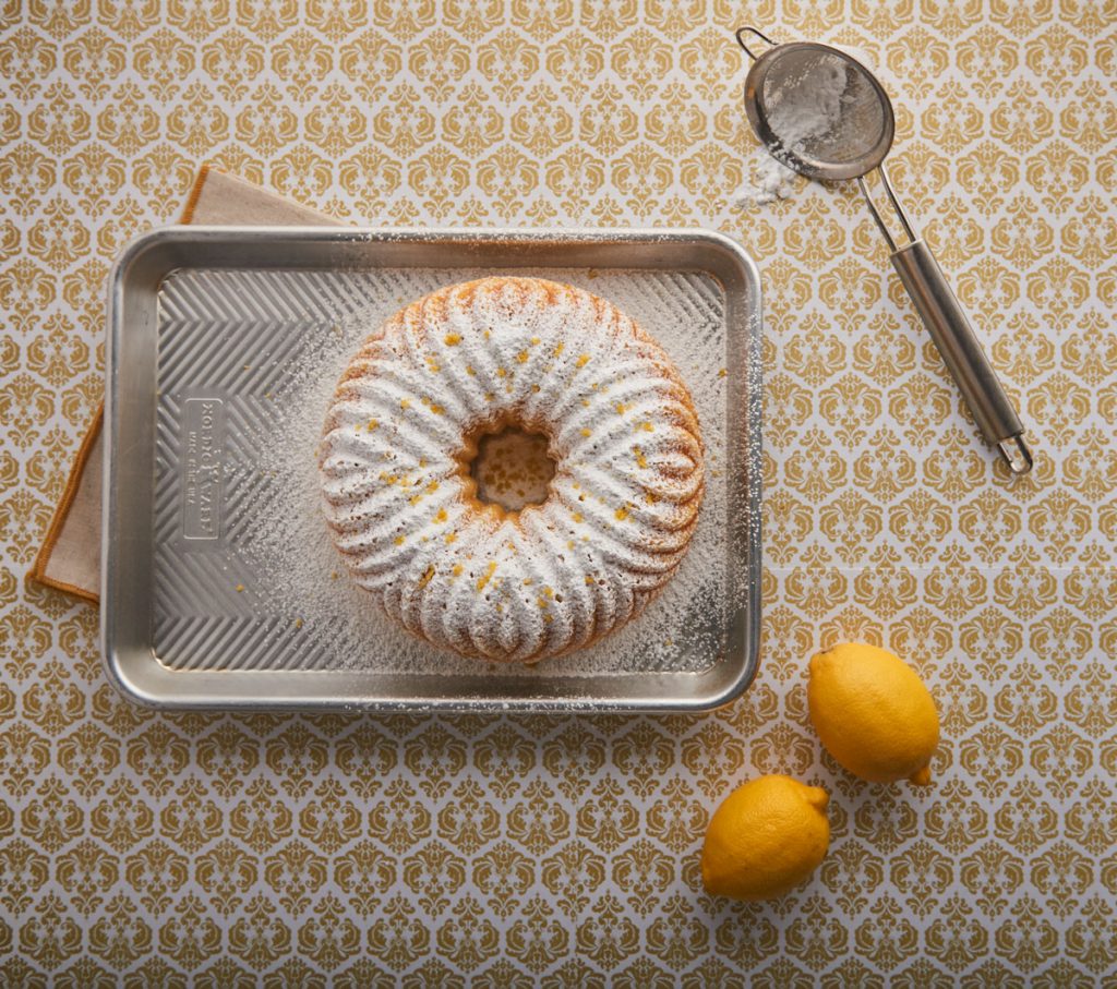 Lemon cake made with lemon-infused olive oil, which replaced butter and lemon zest in the bake. It’s finished with powdered sugar and fresh lemon zest. The spongy texture is full of moisture yet crumbles nicely with each bite.