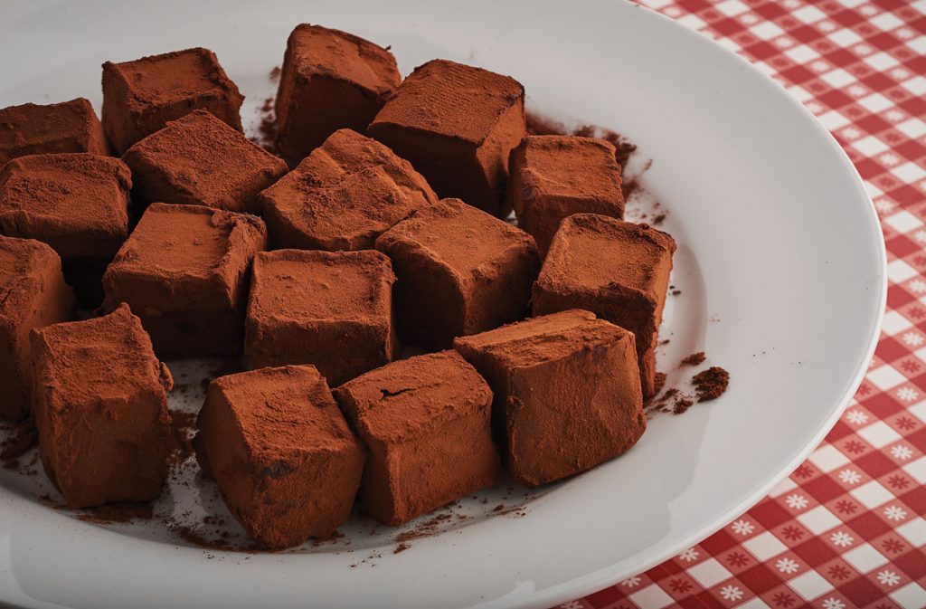 Truffles made with extra virgin olive oil, Ghirardelli 60% dark chocolate, unsalted butter and dusted with Wilbur’s Dutch Processed Cocoa Powder.
